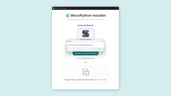 To install the MicroPython firmware, press the INSTALL MICROPYTHON button and wait a few seconds while the installer tool takes care of everything else. When finished, you should see a message in the image below.