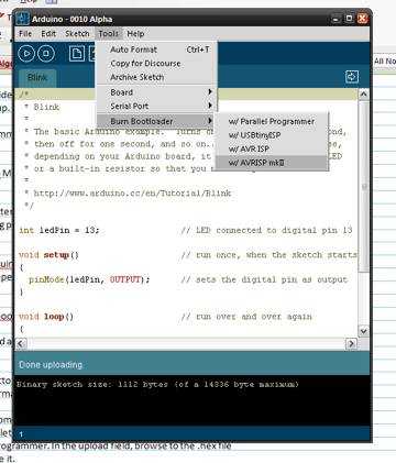 From this point on, the instructions are exactly the same as those for bootloading any Atmel 168 microcontroller. You can use the instructions elsewhere on this site, or continue on.