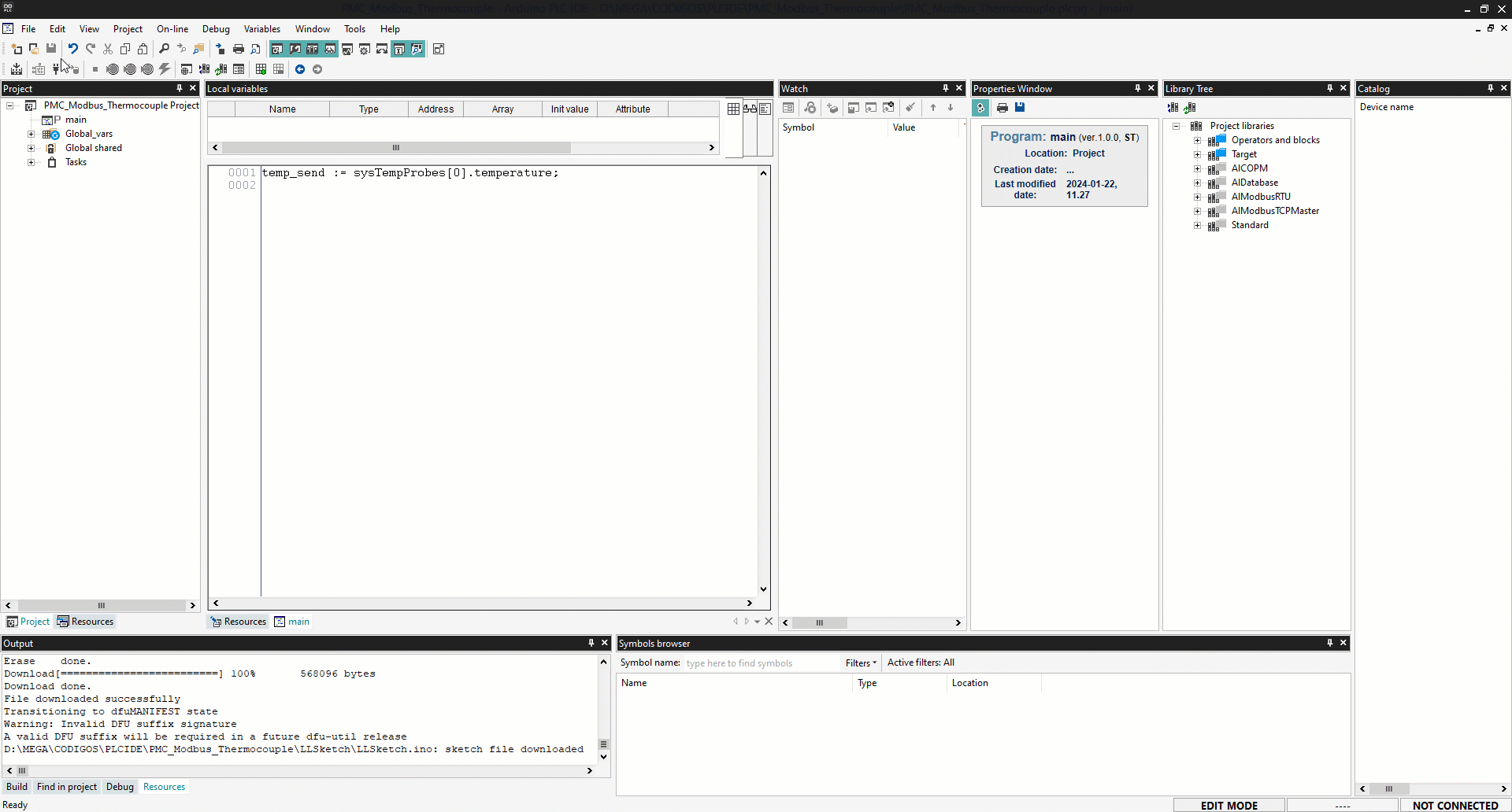 Once uploaded, click on the Connect button again. Now you can monitor the temp_send variable in the Watch window dragging and dropping it from the Global shared variables in the project tab.