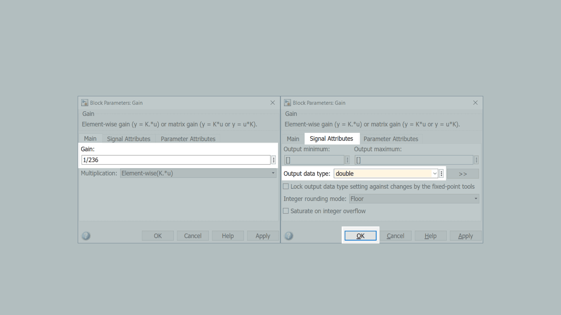 6. In order to configure the gain block, double click and enter 1/236 as the Gain. In the Signal Attributes tab, change the Output data type to