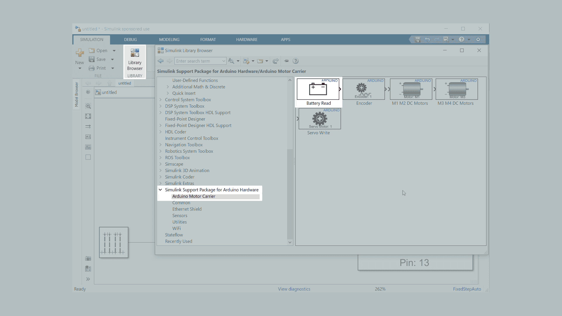 2. From the Simulation ribbon, open up the Library Browser. Scroll down to Simulink Support Package for Arduino Hardware and in the Arduino Motor Carrier subcategory add the Battery Read block to your model.