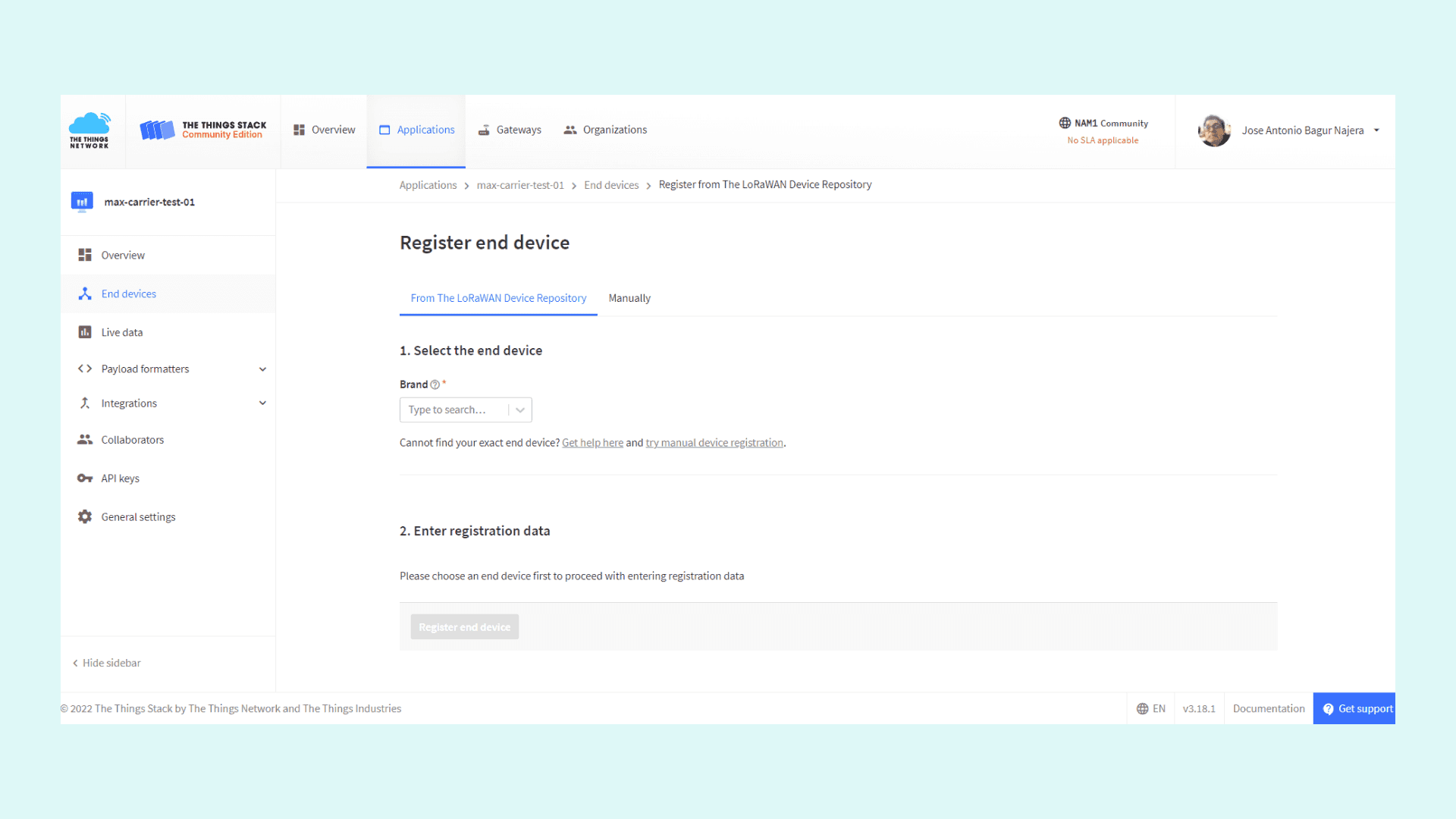 Now, scroll to End devices in the left toolbar and then click on Add end device; a registration page for end devices will open.