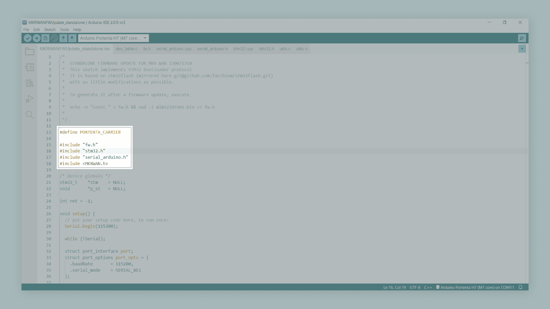 of the MKRWAN library. You can open this example by navigating to File > Examples > MKRWAN. Before uploading the sketch to the Portenta H7 board, open the